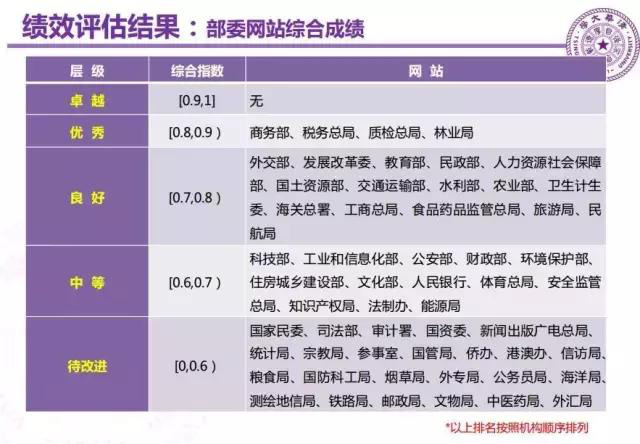 主要评估结果如下,各层级中网站按机构或行政区划顺序排列: