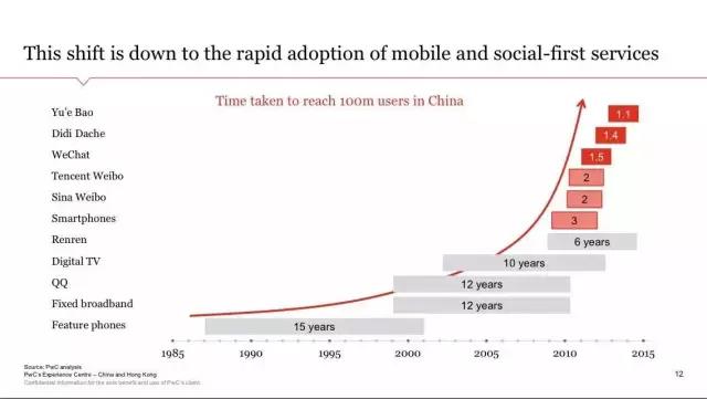 它显示了最近数十年来,科技产品在中国市场获取前一亿用户所需要花费的时间,排在前三位(用时最短)的产品,恰好分别是阿里的余额宝、腾讯的微信和阿里腾讯合投的滴滴,也就是说,这两家公司,共同完成了它们在移动互联网时代的升级,并克服了经济周期的影响。