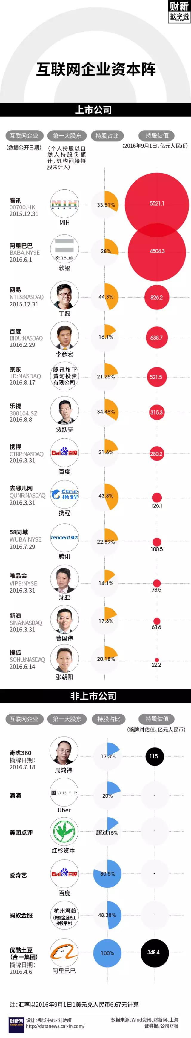 奇虎360于2016年7月从美国退市,据央广网消息,私有化完成后,360董事长周鸿祎的股份将从17.3%提升到22.3%,仍维持第一大股东地位。优酷土豆2016年4月份退市成为阿里旗下一全资子公司,其摘牌时估值达到348.3亿元。对于另外一些非上市的“独角兽”公司,“谁是大老板”就不是那么明朗了,如滴滴、小米、今日头条、美团点评,股权结构尚未完全揭示。