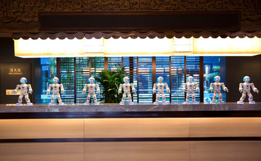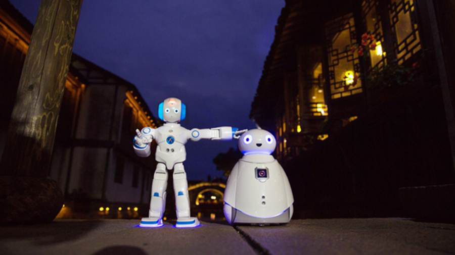 在乌镇东栅注册点,一个酷似大白、外表暖萌可爱的移动机器人正在协助嘉宾注册,并暖心的向与会嘉宾播报当地天气预报及注意事项;而一旁,一群类人机器人则为嘉宾大跳劲舞,各种卖萌,这些外表帅气可爱、身段灵活的机器人随着音乐翩翩起舞、整齐划一、韵律感十足,萌化了所有的与会嘉宾;在咖啡厅,暖萌可爱的移动机器人正在协助点餐。在正厅、论坛、草坪、湖边……,都可以看到这些机器人的身影,夜晚夜游乌镇,如果运气好,还能遇到机器人作导游。
